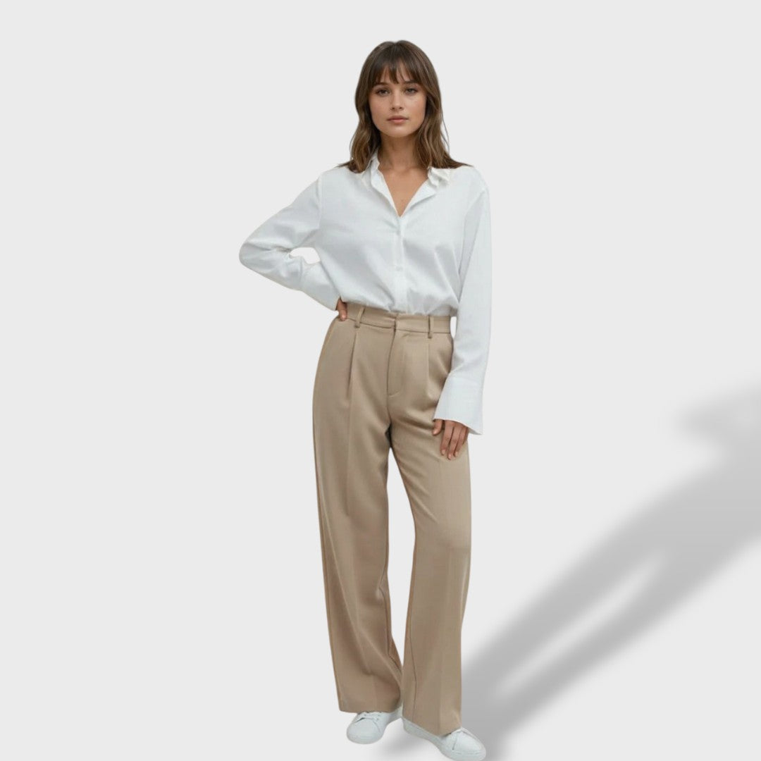 Versatilnost temelji na širokem kroju in tekočem padec, ki omogočata nežen tok oprave in udobje skozi dan. Mehak material, elastičen pas in visoko nameščen pas nudijo popolno prileganje, medtem ko globoki bočni žepi ponujajo priročen prostor za ključne predmete, ne motijo silhuete.