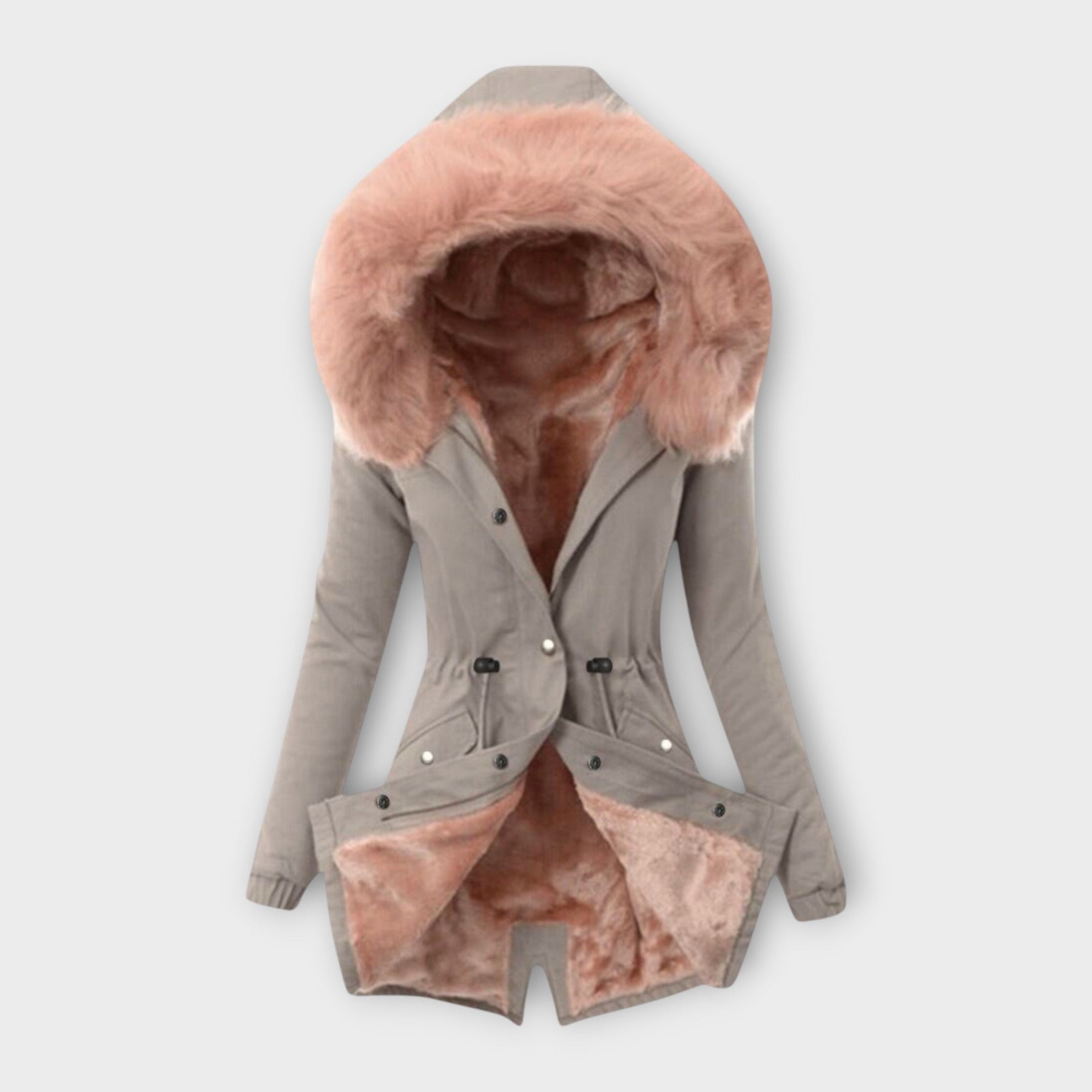 Elegantna kapuca: Velika kapuca s puhastim podloženjem ščiti pred vetrom in dodaja občutek elegance.