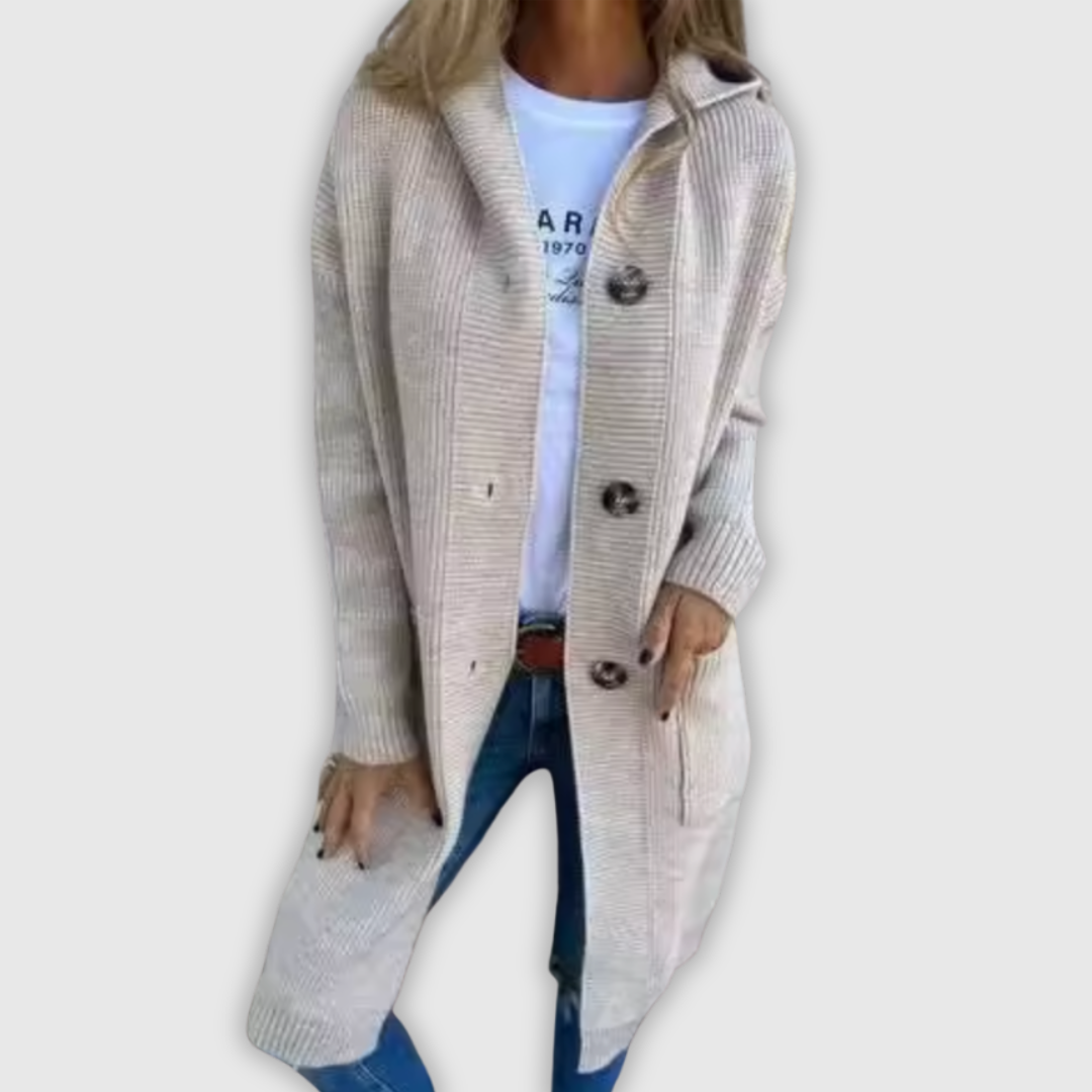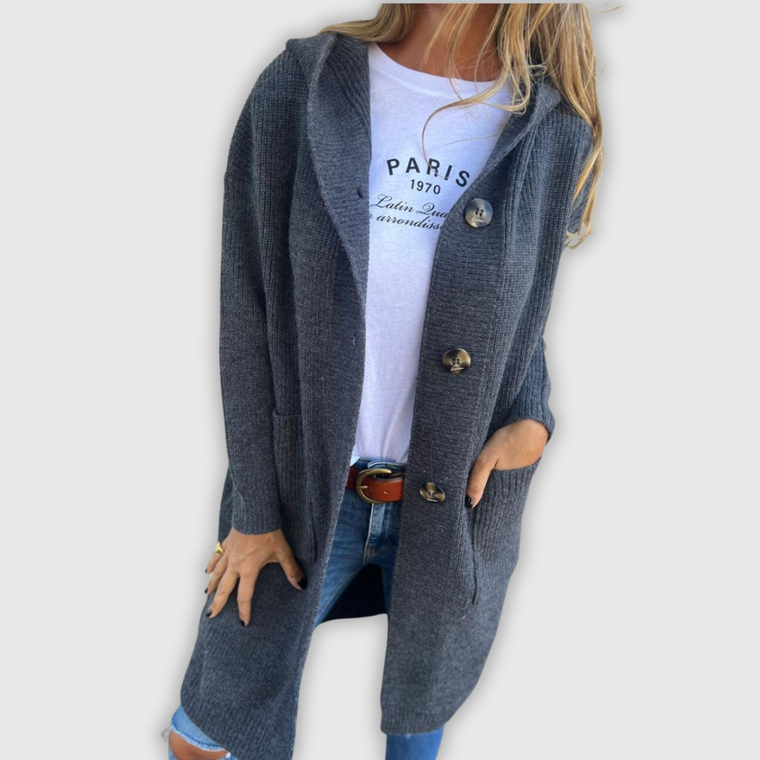 Udoben dolg kardigan v elegantnem in minimalističnem slogu dopolni vsak outfit ter doda toplino in stil.