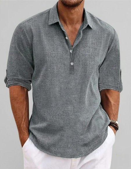 Elegantna bombažna srajca z zračno tkanino dopolnjuje poletne in poslovne outfite z lahkim, svežim občutkom.
